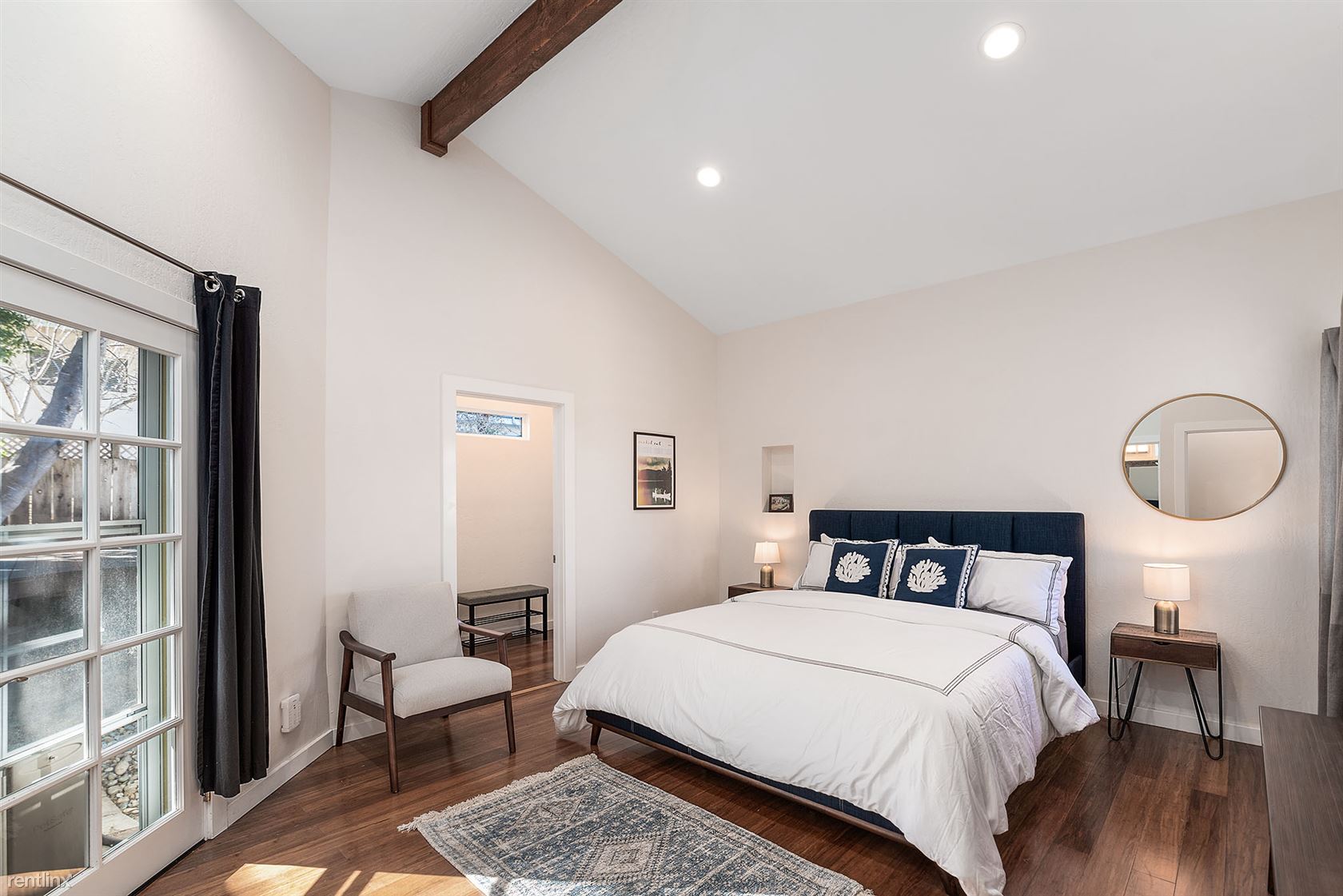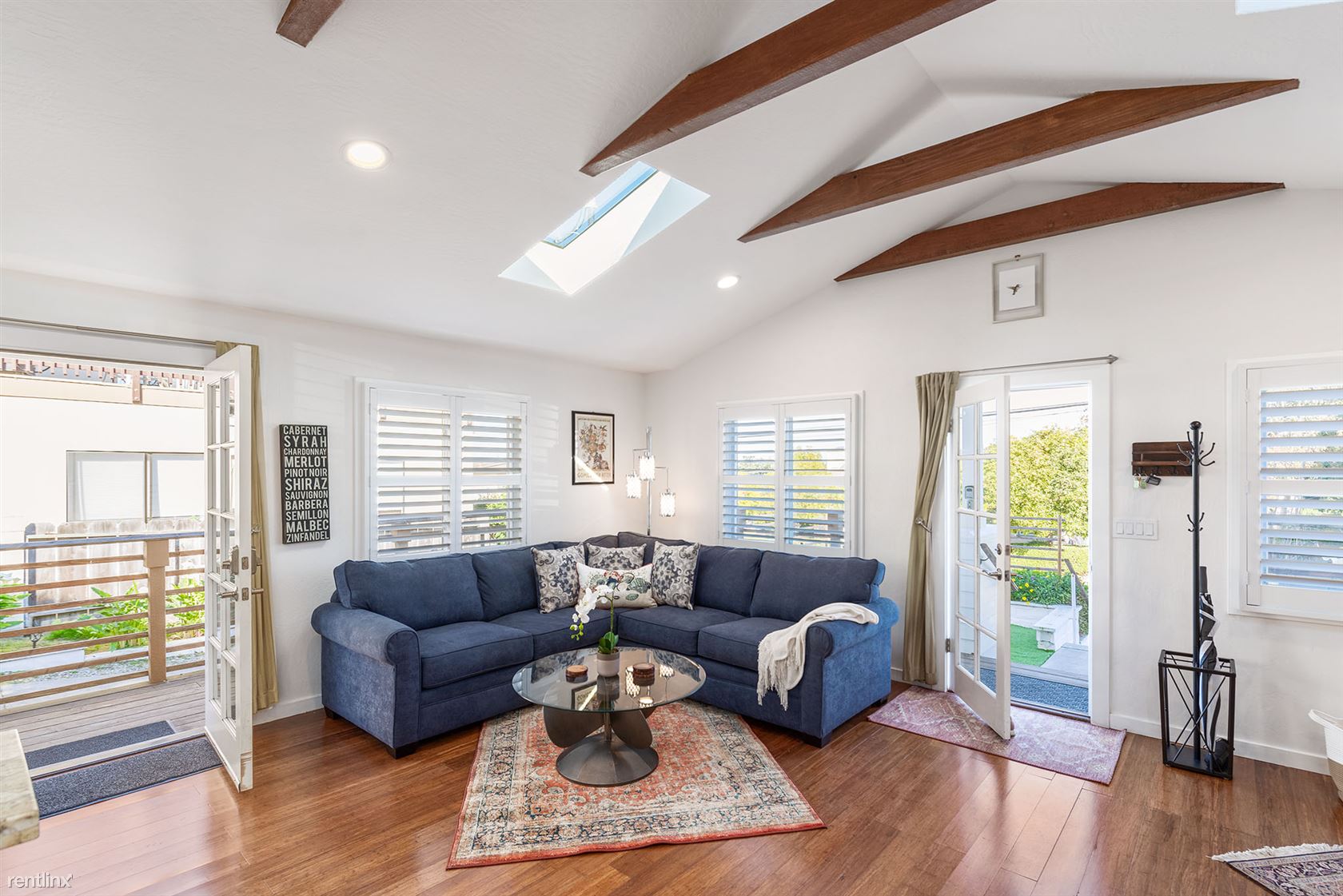 The open and airy great room space that includes the living room, dining room and open kitchen features beautiful wood flooring, a pitched ceiling with beams and a skylight. A peninsula provides seating for 4 looking into the wide galley style kitchen.