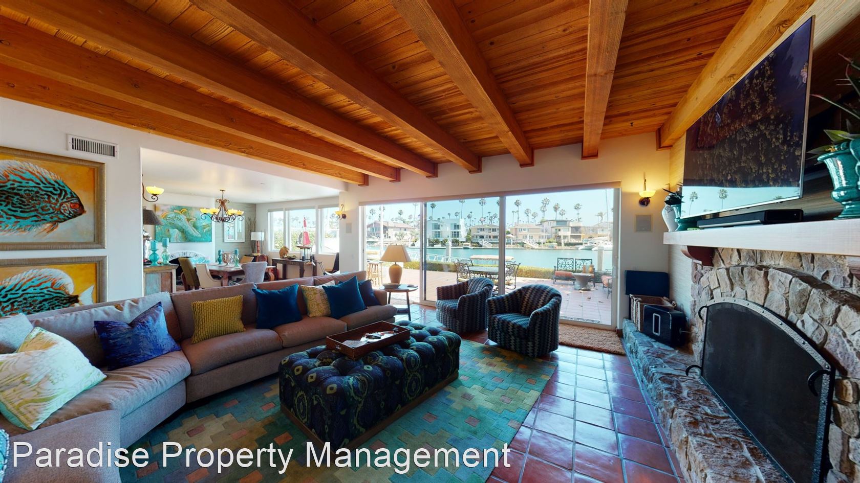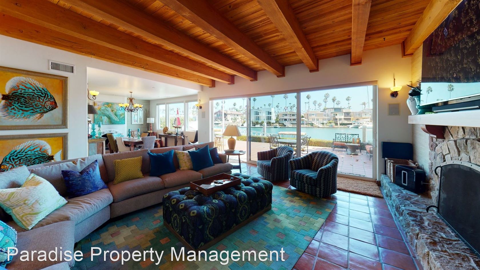 The large open living room features a stone wood-burning fireplace, natural wood beam ceilings and again that special water view.