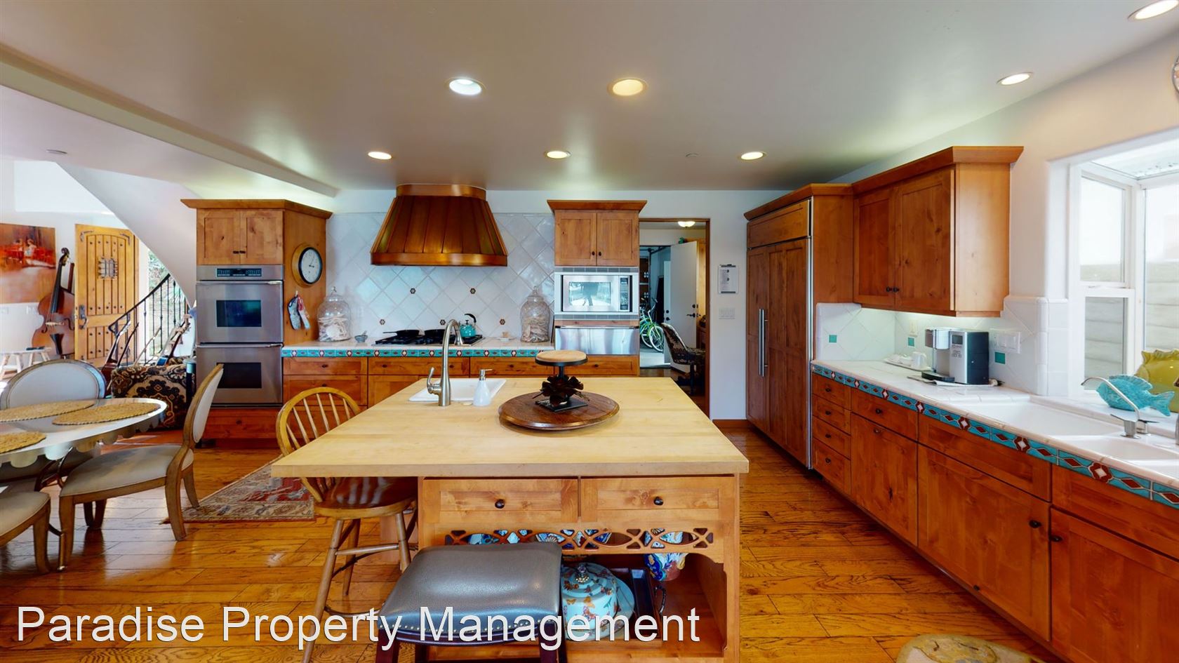 Enjoy a large open kitchen with built in refrigerator, and all stainless steel top-end appliances including Dacor dual convection wall ovens, 5 burner gas cooktop, built-in Dacor microwave oven, Dacor warming drawer, Sub Zero refrigerated drawers in center island, and wine refrigerator.