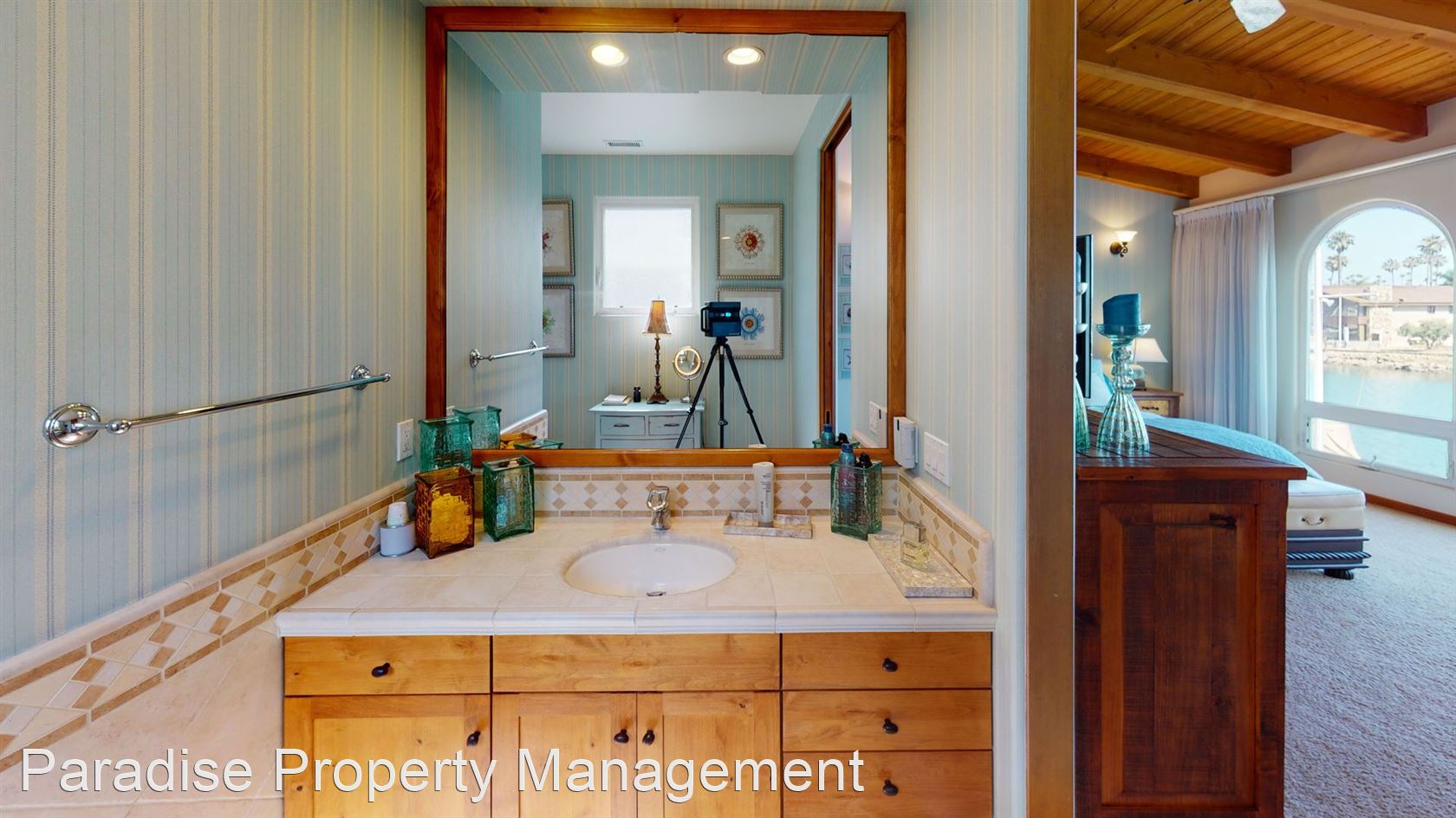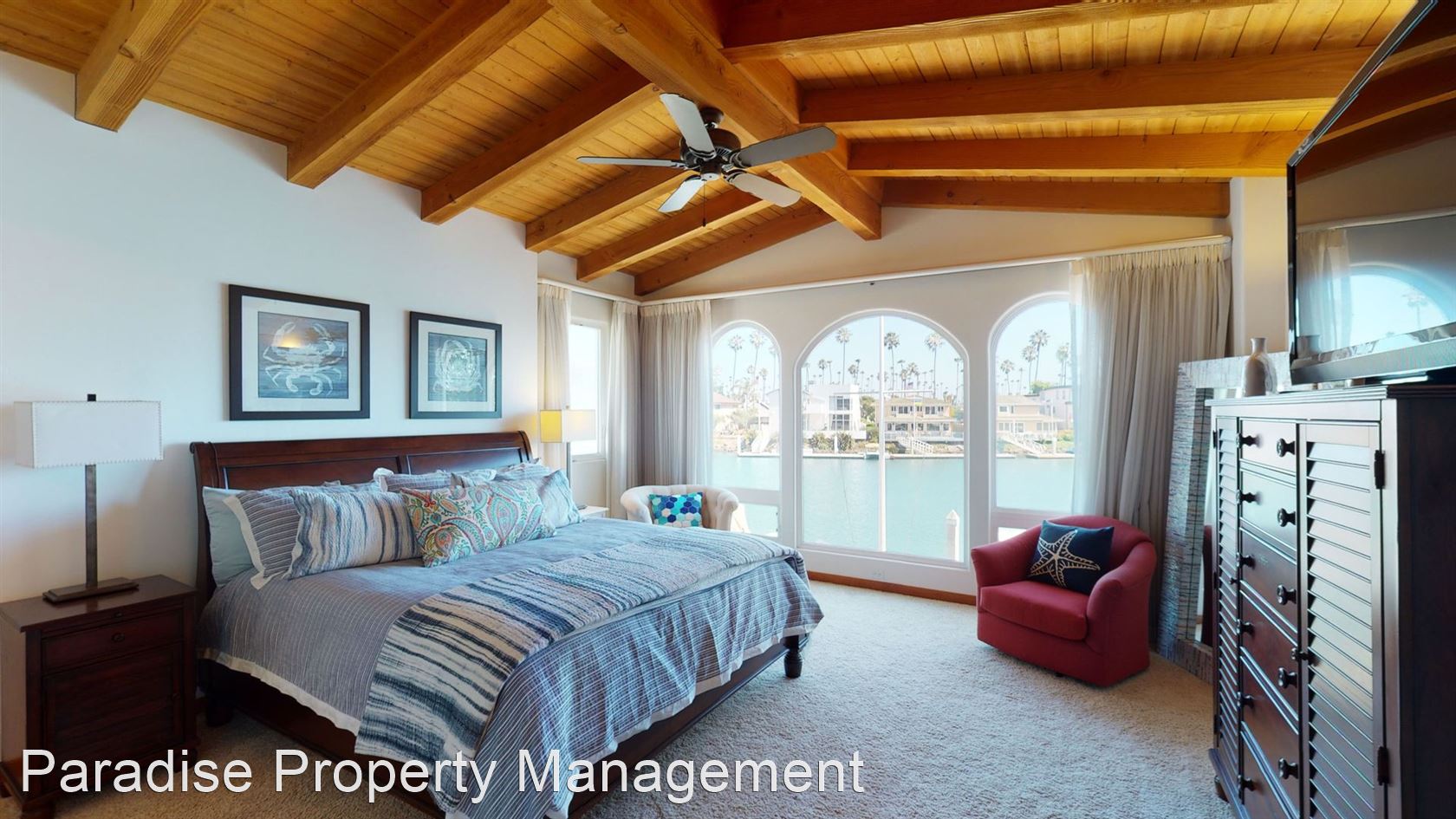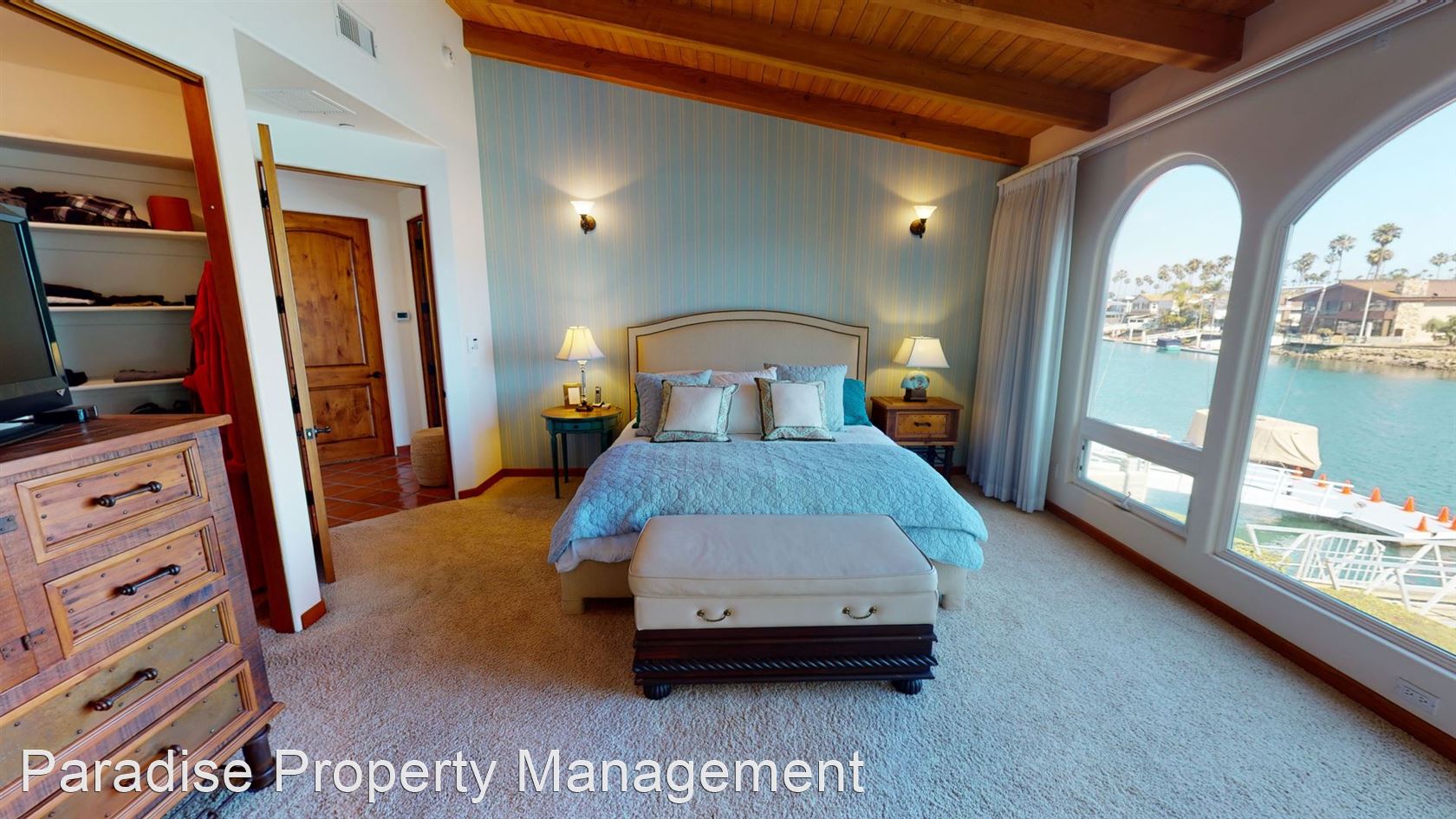 The first master suite has wood beam vaulted ceilings, custom wall sconces, a large walk in closet and en-suite bathroom with dual vanities, and the second master suite features a stone gas fireplace, amazing water views, vaulted wood beam ceilings, en-suite bathroom, and walk-in closet.